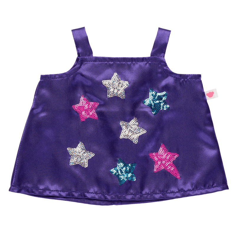 Dress your furry friend like the star they are! This purple stuffed animal dress has colorful sequin stars scattered on the front.