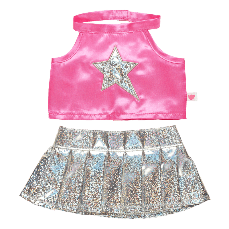 This two-piece stuffed animal outfit includes a bright pink top with a sparkly silver star and a matching silver pleated skirt.